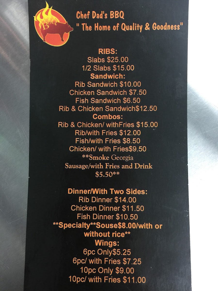If you’re craving smoky, tender BBQ that hits all the right notes, the Chef Dad's Bbq Menu at 1003 N 25th St in Fort Pierce is exactly the kind of spread that gets your taste buds dancing. From the moment you peek at the options, you can tell this isn’t your everyday backyard cookout - each dish has its own twist, whether it’s ribs glazed with that perfect balance of sweet and tangy, pulled pork that practically melts in your mouth, or juicy brisket that’s smoked low and slow to perfection. Don’t skip the sides, either; creamy mac and cheese, buttery cornbread, and tangy slaws make every bite feel like a full celebration. Drinks are ready to wash it all down, but honestly, you might find yourself lingering over the food a little longer than planned because each plate is that satisfying. Scanning the menu, it’s easy to get lost in the variety - whether you’re here for a hearty meal, something to share with friends, or just to treat yourself after a long day, the menu offers exactly what you didn’t even know you were hungry for.